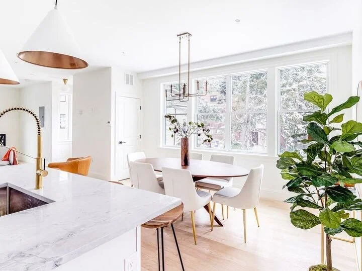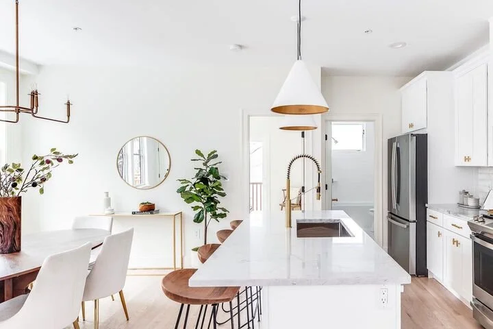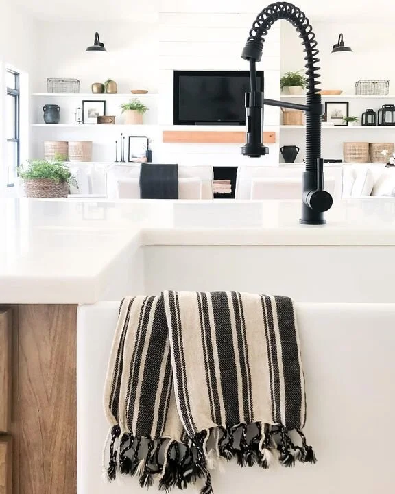 A cohesive design is key if you want to get the most out of your space. This example features a bucolic Farmhouse style that feels both chic and traditionally appealing. Choosing similar materials and complementary surfaces will make your interior feel more curated and aesthetically unified. Also, notice how this ensemble uses warm earth tones and wood in the kitchen, whereas the dining area is much brighter and features an almost completely white palette with hints of greenery. Adopt this traditional yet timeless trend by easily installing a VIGO Matte Stone™ Farmhouse Kitchen Sink. With a variety of apron fronts, you can choose a farmhouse sink that fits in with the rest of your home style. Your design can change slightly from room to room, just make sure that there’s a discernible flow and sensible layout.