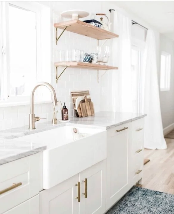 While dark metals lend a cooler vibe, brass has a warmer feeling. Combining the rich browns of brass and natural wood is a great way to create a more inviting atmosphere in your kitchen, plus the contrast between the two materials lends an all-white kitchen a natural and more exciting charm. Try experimenting with different color combinations to discover the perfect palette for your kitchen. Installing kitchen shelves using sustainable wooden shelves with brass brackets is an easy way to integrate this trend into your kitchen design.