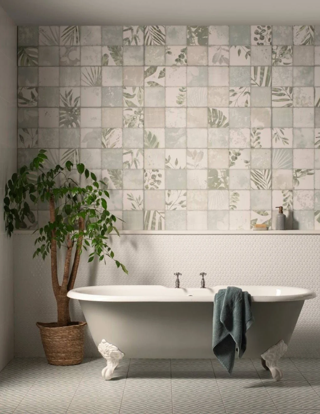 Sometimes we can’t have it all, aka having a windowless bathroom. For the bathrooms without a window to bring in more natural light, patterned floors give the illusion of more space. Pairing the floor pattern with the style of the interior fixtures gives you more space without the natural light.